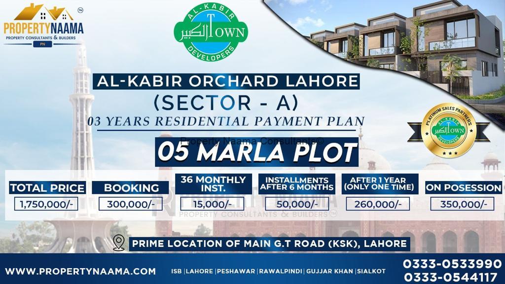 - Therefore, you can instantly get a capital gain of a hefty 16, 50,000 /- by investing in Al-Kabir Orchard Lahore. You can pay the price of the plot in 3.5 years easy monthly installment plan.